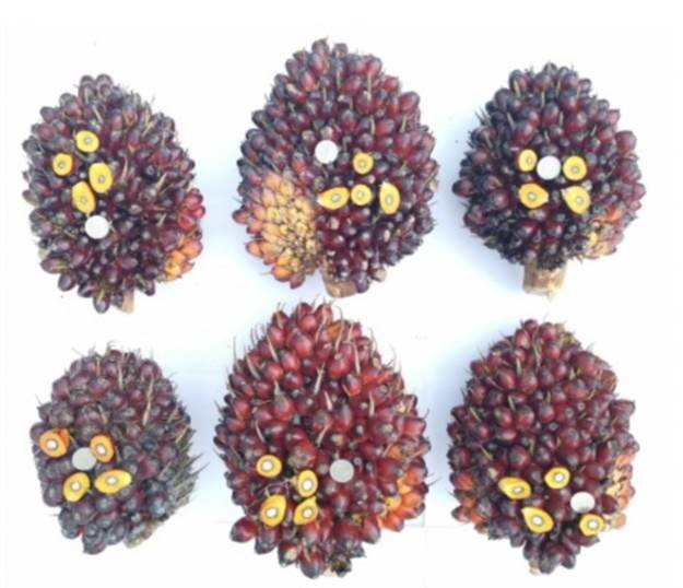 Perbezaan ciri buah tandan segar klon CPS3 (atas) dengan DxP yang ditanam di Estet Sedenak milik Kulim - Foto ihsan MPOB